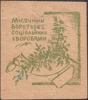 1932(?) г. Разм. 54 х 58 мм. Одноцветная печать на тол-стой желтоватой бумаге низкого качества. В центре ветка шиповника, серп и молот. В правом верхнем углу текст на украинском языке в четыре строки: «Месячник борьбы с социальными болезнями».