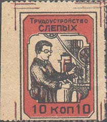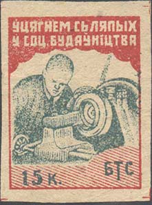1931 г. Разм. рамки 32 х 42 мм. Двухцветная печать на сероватой рыхлой бумаге. Слепой токарь у станка. Сверху текст на белорусском языке: «Вовлечем слепых в соц[иалистическое]. строительство». Внизу номинал и аббревиатура на белорусском языке: «БОС».