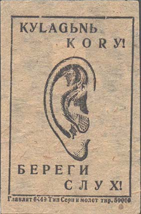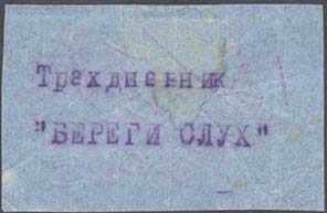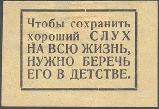 1927(?) г. 54 х 35 мм. Одноцветная печать на серо-синей бумаге. В центре в прямоугольной рамке разм. 40 х 27 мм текст в шесть строк: «Берегите слух детей. Долой варварский обычай драть детей за уши, от таких «воспитательных мер» дети теряют слух».
