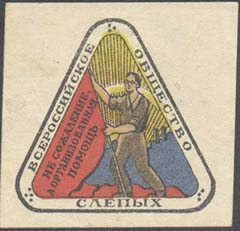 1932(?) г. Разм. 38 х 38 мм. Многоцветная печать на белой бумаге. В треугольной с закругленными краями рамке на фоне восходящего солнца слепой держит флаг, на котором текст: «Не сожаление, а организованная помощь». По периметру рамки текст: «Всероссийское общество слепых».