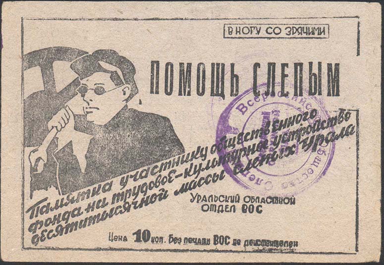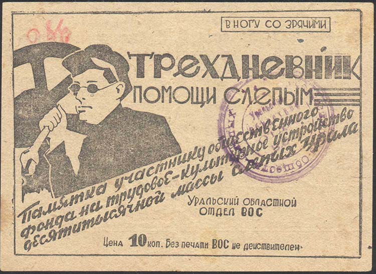 1932 г. Областной сбор. Одноцветная двухсторонняя печать на толстой бумаге низкого качества различных цветов. На лицевой стороне в рамке разм. 116 х 82 мм слева слепой рабочий с гаечным ключом на фоне заводского оборудования. Текст: «В ногу со зрячими. Трехдневник помощи слепым. Памятка участнику общественного фонда на трудовое-культурное устройство десятитысячной массы слепых Урала. Уральский областной отдел ВОС. Цена 10 коп. Без печати ВОС не действителен». На оборотной стороне фрагмент речи М.И.Калинина к Всероссийскому трехдневнику помощи слепым. Внизу мелким шрифтом выходные данные: «Уралоблит N 5173. Изд. Общества Слепых Тираж 100000 Свердловск, «Уралполиграф», тип. «Гранит». зак. N 2796». На лицевой стороне фиолетовый оттиск круглой печати Уральского областного отделения ВОС.