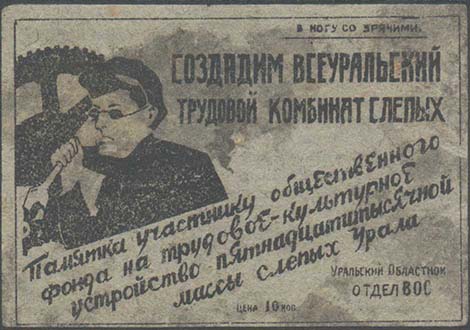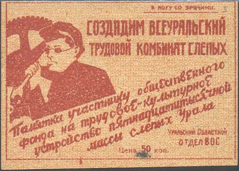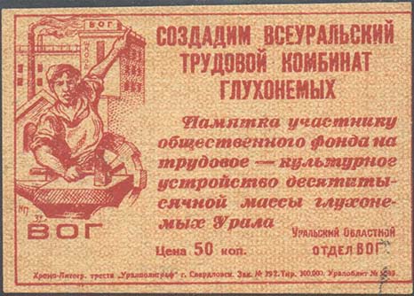 1931 г. Двухцветная двухсторонняя печать на плотной желтоватой бумаге. На лицевой стороне в рамке разм. 75 х 52 мм слева слепой рабочий с гаечным ключом на фоне заводского оборудования. Текст: «В ногу со зрячими. Создадим Всеуральский Трудовой комбинат слепых слепым. Памятка участнику общественного фонда на трудовое-культурное устройство десятитысячной массы слепых Урала. Уральский областной отдел ВОС. Цена ... коп. На оборотной стороне фрагмент в рамке разм. 75 х 51 мм слева рабочий с молотом и наковальня на фоне заводских корпусов. Текст: «Создадим всеуральский трудовой комбинат глухонемых. Памятка участнику общественного фонда на трудовое-культурное устройство пятнадца-титысячной массы глухонемых Урала. Уральский Областной отдел ВОГ. Цена 50 коп.». Внизу мелким шрифтом выходные данные: «Хромо-Литогр. Треста «Уралполиграф» г. Свердловск Зак №392. Тир. 300.000. Уралоблит N 3699».