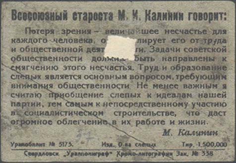 1932 г. Областной выпуск. Одноцветная двухсторонняя печать на толстой бумаге низкого качества различных цветов. На лицевой стороне в рамке разм. 75 х 52 мм слева слепой рабочий с гаечным ключом на фоне заводского оборудования. Текст: «В ногу со зрячими. Создадим всеуральский трудовой комбинат слепых. Памятка участнику обще-ственного фонда на трудовое-культурное устройство пятнадцатитысячной массы слепых Урала. Уральский областной отдел ВОС. Цена 10 коп.». На оборотной стороне фрагмент речи М.И.Калинина к Всероссийскому трехдневнику помощи слепым. Внизу мелким шрифтом выходные данные: «Уралоблит N 5173. Изд. О-ва Слепых Тираж 100000 Свердловск, «Уралполиграф», Хро-мо-литография. зак. N 338».