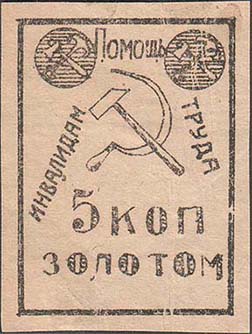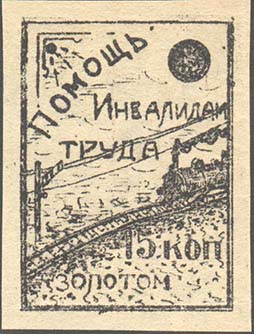 1924 г. Разм. рамки 35 х 48 мм. Одноцветная печать на желтоватой бумаге. Различные сюжеты. Текст: «Помощь инвалидам труда». Номинал в золотой валюте.