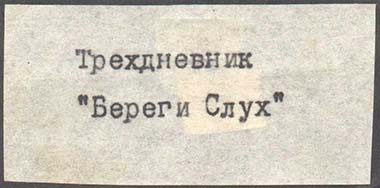1927(?) г. Разм. 60 х 30 мм. Одноцветная печать на бумаге различных цветов. В центре машинописный текст в две строки: «Трехдневник «Берегите слух»».
