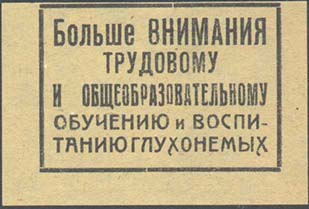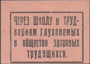 1927(?) г. Разм. 50 х 35 мм. Одноцветная печать на бумаге различных цветов. В центре в прямоугольной рамке разм. 28 х 40 мм текст в четыре строки: «Через школу и труд - вернем глухонемых в общество здоровых трудящихся».