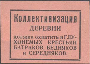 1927(?) г. Разм. 50 х 36 мм. Одноцветная печать на желто-серой бумаге. В центре в прямоугольной рамке разм. 40 х 28 мм текст в шесть строк: «Коллективизация деревни должна охватить и глухонемых крестьян батраков, бедняков и середняков».