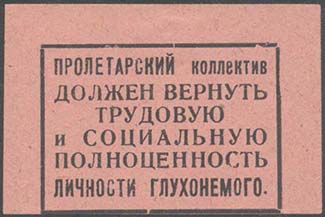 1927(?) г. Разм. 50 х 36 мм. Одноцветная печать на бумаге различных цветов. В центре в прямоугольной рамке разм. 40 х 28 мм текст в шесть строк: «Пролетарский коллектив должен вернуть трудовую и социальную полноценность личности глухонемого».