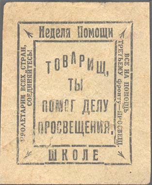 1922 г. 30.11.1922 г. Разм. 52 х 63 мм. Одноцветная печать на тонкой желто-коричневой бумаге. В центре в двойной прямоугольной рамке разм. 40 х 49 мм текст в четыре строки: «Товарищ, ты помог делу просвещения». По периметру между рамками текст: «Неделя помощи школе. Пролетарии всех стран соединяйтесь! Все на помощь третьему фронту – просвещ[ению].».