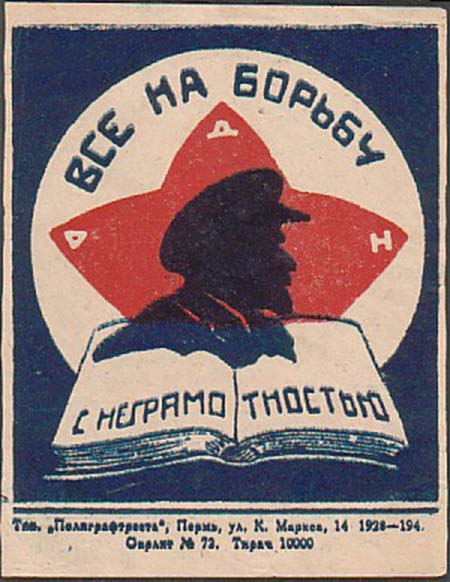 1928 г. Разм. 75 х 95 мм. Двухцветная печать на плотной белой бумаге. В центре на сплошном фоне эмблема общества ОДН: раскрытая книга на фоне пятиконечной звезды с профилем В.И.Ленина и аббревиатурой «ОДН» и текстом: «Все на борьбу с неграмотностью». Внизу под чертой выходные данные мелким шрифтом в две строки: «Тип. «Полиграфтреста», Пермь. ул. К.Маркса, 14 1928 – 194. Окрлит №72. Тираж 10000».