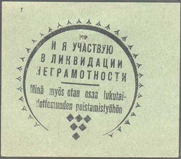 1930(?) г. Разм. 62 х 54 мм. Одноцветная печать на светло-зеленой бумаге. В центре в рамке в виде неполного круга с декоративными элементами текст в три строки: «И я участвую в ликвидации неграмотности». Внизу под чертой текст в две строки на местном языке. Внизу декоративные элементы в виде ромбиков.