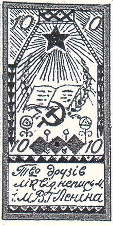 1925 г. Разм. рамки 30 х 59 мм. Трехцветная печать на белой бумаге. Зубц. 11 1/2. В двойной прямо-угольной рамке в обрамлении декоративных элементов в центре раскрытая книга и серп и молот. Сверху пятиконечная звезда с лучами. По углам рамки номинал. Внизу в отдельной рамке текст в три строки на украинском языке «О-во друзей ликвид[ации]. неграм[отности]. им. В.И.Ленина».