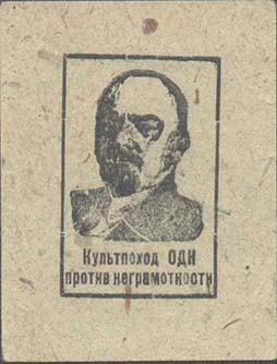 1932 г. Разм. 43 х 56 мм. Одноцветная печать на светло-серой бумаге низкого качества. В центре в прямоугольной рамке разм. 24 х 38 мм портрет В.И.Ленина. Внизу текст в две строки: «Культпоход ОДН против неграмотности».