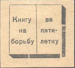 1931 г. 19.05.1931 г. Разм. 42 х 38 мм. Одноцветная печать на желтоватой бумаге. В центре стилизованное изображение раскрытой книги, на развороте ко-торой текст в три строки: «Книга на борьбу за пятилетку».