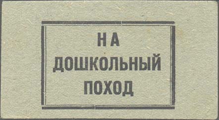 1931 г. 07.03.1931 г. Разм. 76 х 56 мм. Одноцветная печать на серо-оранжевой бумаге. В центре в прямоугольной рамке разм. 54 х 38 мм текст в три строки: «Внес на дошкольный поход».