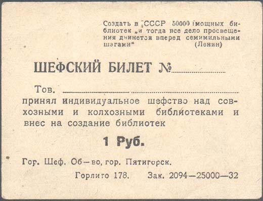 1932(?) г. Разм. 87 х 66 мм. Одноцветная печать на желтоватой бумаге. В центре текст в шесть строк: «Шефский билет №...Тов. ... принял индивидуальное шефство над совхозными и колхозными библиотеками и внес на создание библиотек 1 Руб.». В правом верхнем углу текст в четыре строки: «Создать в СССР 50000 мощных библиотек «и тогда все дело просвещения двинется вперед семимильными шагами» (Ленин)». Внизу мелким шрифтом выходные данные в две строки: «Гор. Шеф. Об-во гор. Пятигорск. Горлито 178. Зак. 2094-25000-32».