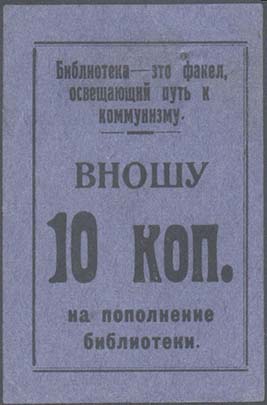 1925(?) г. Разм. 44 х 67 мм. Одноцветная печать на бумаге различных цветов. В двойной прямоугольной рамке разм. 36 х 56 мм сверху текст в три строки: «Библиотека – это факел, освещающий путь к коммунизму». Ниже текст в четыре строки: «Вношу ... коп. на пополнение библиотеки».