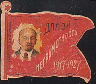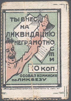 1932(?) г. Разм. 38 х 65 мм. Одноцветная печать на бумаге различных цветов. В центре в овале портрет В.И.Ленина. Внизу текст в три строки на украинском языке: «Неграмотность – враг соц[иалистического]. строительства».