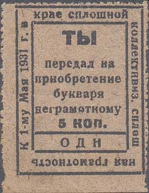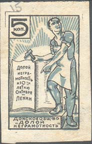 1931 г. Разм. 36 х 49 мм. Одноцветная печать на бумаге различных цветов. В центре в рамке в виде книге разм. 22,5 х 36 мм в центре текст в четыре строки: «О-во «Долой неграмотность»». Сверху текст в две строки: «Ростов[ский]. Уезд[ный]. Отдел». Внизу номинал.