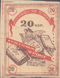 1932 г. Разм. рамки 29 х 39 мм. Двухцветная печать на желтоватой бумаге. Нерегулярная зубц. В центре в тройной прямоугольной рамке книги и газеты. По диагонали на ленте текст в две строки: «Культурный фронт». Сверху номинал и лента с текстом: «Пролетарии всех стран соединяйтесь!». По углам внутренней рамки номинал.