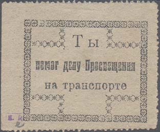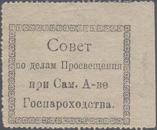 1930(?) г. Одноцветная двухсторонняя печать на зелено-серой бумаге. Зубц. 11 1/2. На лицевой стороне в прямоугольной декоративной рамке разм. 41 х 33,5 мм текст в четыре строки: «Совет по делам Просвещения при Сам[арском]. А[гентст]-ве Госпараходства». На оборотной стороне в прямоугольной декоративной рамке разм. 40,5 х 33,5 мм текст в три строки: «Ты помог делу просвещения на транспорте».