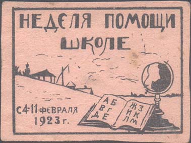 1923 г. 04.-11.02.1923 г. Разм 63 х 46 мм. Одноцветная печать на розово-серой бумаге. В центре в прямоугольной рамке разм. 57 х 42 мм на фоне сельского пейзажа глобус и открытая книга с буквами русского алфавита. Сверху текст в две строки: «Неделя помощи школе». В левом нижнем углу текст в две строки: «с 4-11 февраля 1923 г.».
