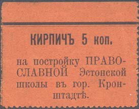 1917(?) г. Разм. по перфорации 45 х 35 мм. Одноцветная печать на оранжево-красной бумаге. Зубц. 11 1/12. В центре текст в пять строк: «Кирпич 5 коп. на постройку православной Эстонской школы в гор. Кронштадт».
