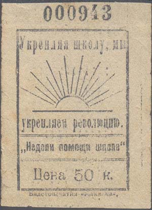 1923 г. Разм. 50 х 68 мм. Одноцветная печать на бумаге различных цветов. В центре в прямо-угольной рамке разм. 37 х 54 мм сверху восходящее солнце с лучами. Ниже между двумя горизонтальными чертами текст: «Неделя помощи школе». Сверху и в центре различные тексты. Сверху номер, проставленный нумератором. Внизу номинал. Внизу под рамкой мелким шрифтом выходные данные: «Билетопечатня Маклина».