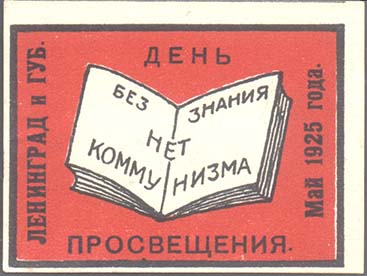 1925 г. 31.05.1925 г. Разм. рамки 56 х 41 мм. Двухцветная печать на плотной белой бумаге. В центре в прямоугольной рамке раскрытая книга, на развороте которой текст в три строки: «Без знания нет коммунизма». По внутреннему периметру рамки текст: «Ленинград и губ[ерния]. День просвещения. Май 1925 года».