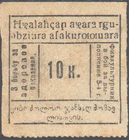 1931 г. Разм. рамки 37 х 36 мм. Одноцветная печать на желтоватой бумаге. Зубц. 11 1/2. В центре в прямоугольной рамке номинал. Слева вертикально текст в три строки: «В борьбу за здоровое поколение». Справа вертикально текст в три строки: «Физкультурник в бой за выполнение 5-4 г.». Сверху текст в две строки на абхазском языке латинским шрифтом. Внизу текст в две строки на грузинском языке.