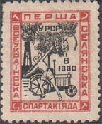 1930 г. Разм. рамки 19 х 23,5 мм. Двухцветная печать на белой бумаге. Зубц. Лин. 11 1/2. С клеем. В двойной прямоугольной рамке в центре спортсмен бросает копье. На заднем плане дымящие трубы и трактор. Текст на украинском языке в три строки: «УССР. Киев. 1930». По периметру между рамками текст на украинском языке: «Первая всеукраинская крестьянская спартакиада». По углам между рамками серпы и молоты.