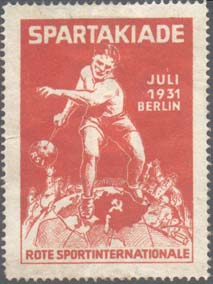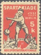 1931 г. Разм. рамки 29 х 41 мм. Одноцветная печать на кремовой белой. Зубц. 14. В центре эмблема КСИ. Сверху и справа текст на немецком языке: «Спартакиада июль 1931 Берлин». Справа номинал. Внизу текст на немецком языке: «Красный спортивный интернационал».