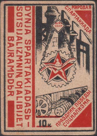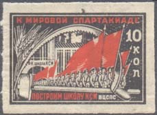 1932 г. Разм. рамки 33 х 22 мм. Двухцветная печать на белой бумаге с В.З. «Ковер». С клеем. В центре в двойной прямоугольной рамке, образованной серпом и молотом колонна спортсменов с красными флагами. Слева вертикально номинал. Сверху текст: «К мировой спартакиаде». Внизу текст: «Построим школу КСИ ВЦСПС».