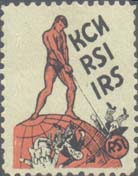 1934(?) г. Рамки по перфорации 23 х 29 мм. Двухцветная печать на кремовой бумаге. Зубц. 11. С клеем. В центре эмблема КСИ: спортсмен с молотом на фоне земного шара. Справа по диагонали аббревиатура «КСИ» на русском, французском и английском языках.