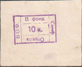 1924(?) г. Листок разм. 115 x 67 мм. Одноцветная печать на желтоватой бумаге. В прямоугольной рамке разм. 93 х 53 текст в семь строк: «Комсомол СССР поможет рабочим Запада свергнуть гнет фашизма. Боевой фонд им. Карла Либкнехта Помощи жертвам фашистской реакции и белого террора. Александрийский Окрком КСМУ».