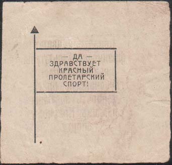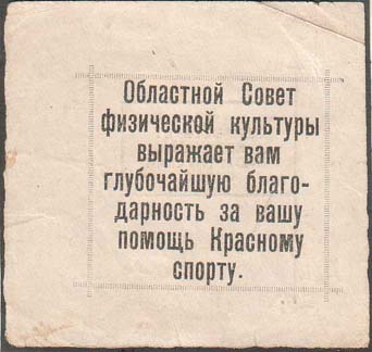 1930(?) г. Разм. рамки 56 х 54 мм. Одноцветная двухсторонняя печать на белой бумаге. На лицевой стороне в прямоугольной рамке разм. 37,5 х 33 мм текст семь строк: «Областной Совет физической культуры выражает вам глубочайшую благодарность за вашу помощь Красному спорту». На оборотной стороне стилизованное изображение флажка с текстом в четыре строки: «Да здравствует красный пролетарский спорт!».
