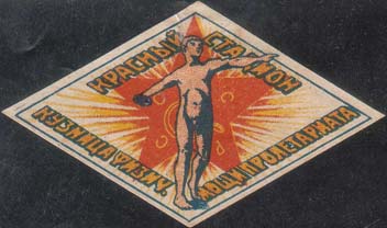 1928(?) г. Ромб разм. 59 х 35 мм. Трехцветная печать на белой бумаге. В рамке в форме ромба разм. 55 х 32 мм в центре на фоне звезды обнаженный спортсмен-метатель диска. Текст: «Красный стадион кузница физич[еской].мощи пролетариата».