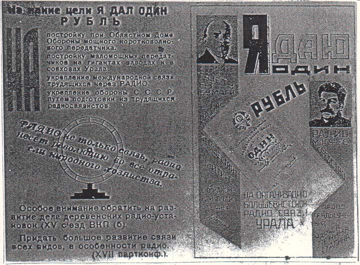 1931 г. Листок разм. 134 х 98 мм. Многоцветная двухсторонняя печать на сероватой бумаге. На лицевой стороне справа в прямоугольной рамке разм. 58 х 88 мм в центре банкнота в 1 рубль и текст в семь строк: «Я даю один рубль на организацию большевистской радио связи Урала». Слева портрет В.И.Ленина и текст в десять строк: «Стройте газету без бумаги. Радио осуществит митинг с миллионной аудиторией. Ленин». Справа портрет И.В.Сталина и текст в девять строк: «Радио – могучее средство пропаганды учения Маркса, Ленина, Сталина». Слева сверху текст в тринадцать строк: «На какие цели я дал один Рубль. На постройку при Областном Доме Обороны мощного коротковолнового передатчика. На постройку маломощных передатчиков на гигантах заводах и в колхозах Урала. На укрепление международной связи трудящихся через радио. На укрепление обороны С.С.С.Р. путем подготовки из трудящихся радиосвязистов». Слева в центре стилизованное изображение громкоговорителя и текст в три строки по диагонали: «Радио не только связь, радио несет революцию во все отрасли народного хозяйства». Слева внизу текст в шесть строк: «Особое внимание обратить на развитие деревенских радио-установок (XV съезд ВКП(б)). Придать большое развитие связи всех видов, в особенности радио. (XVII партконф[еренция].)». На оборотной стороне в прямоугольной рамке разм. 124 х 88 мм аграрно-индустриальный пейзаж. Слева радиовышка. Слева снизу схематическое изображение расходящихся радиоволн. Сверху текст в две строки: «Радио – надежное средство производственной и культурной связи трудящихся». В центре текст в семь строк: «Радио - рупор революции. ОДР – проводник решений партии в радиофикации страны». В левом нижнем углу текст семь строк: «За крепкую постоянную радио Связь между социалистическими предприятиями. Все в ряды Общества Друзей Радио». Внизу под рамкой выходные данные мелким шрифтом: «Хромолитография «Уралкнижтреста». Горлит №398. Зак. №295. Тир. 200000».