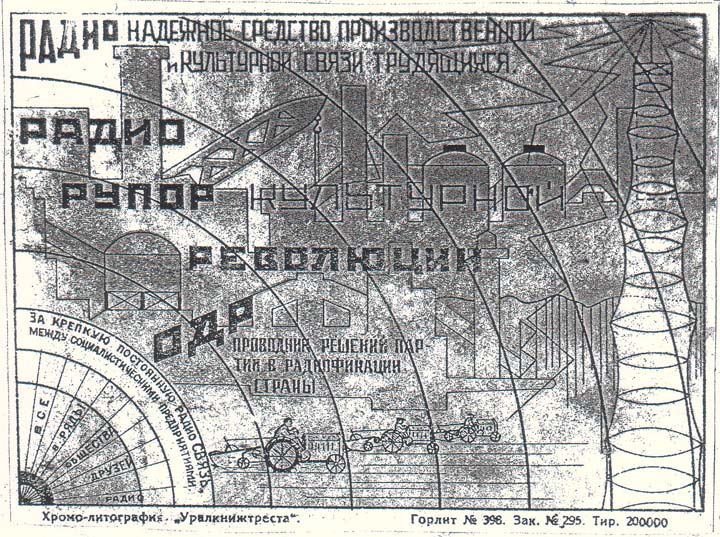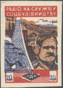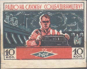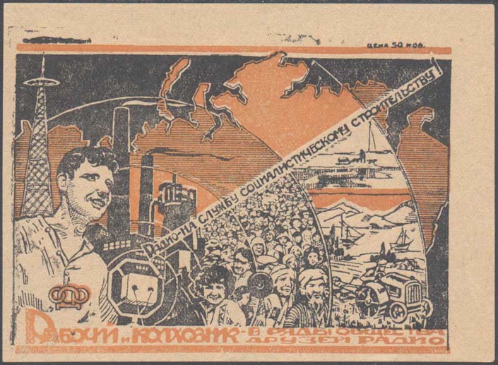 1932 г. Листок разм. 118 х 85 мм. Двухцветная печать на желтоватой бумаге. В прямоугольной рамке разм. 104 х 73 мм слева человек перед микрофоном на фоне радиомачты и завода. Справа на фоне контурного изображения карты СССР и схематически изображенных радиоволн скопление людей разных национальностей, трактор, работающий в поле, корабли и упряжка с нартами. По диагонали текст: «Радио – на службу социалистическому строительству!». Внизу текст в три строки: «ОДР. Рабочий и колхозник – в ряды общества Друзей Радио». Сверху справа номинал: «Цена 50 коп.».