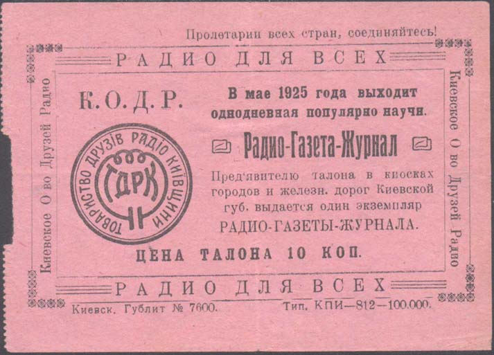 1925 г. Листок из квитанционной книжки разм. 119 х 85 мм. Одноцветная печать на тонкой розовой бума-ге. Левосторонняя Зубц. 11 1/2. В двойной прямоугольной рамке с декоративными элементами по углам справа текст в семь строк: «В мае 1925 года выходит однодневная популярно научн[ая]. Радио-Газета-Журнал. Предъявителю сего талона в киосках городов и железн[ых]. дорог Киевской губ[ернии]. Выдается один экземпляр Радио-Газеты-Журнала». Слева сверху аббревиатура «К.О.Д.Р.» Ниже эмблема общества. Внизу текст: «Цена талона 10 коп.». По периметру между рамками текст, повторенный дважды: «Киевское О-во Друзей Радио. Радио для всех». Сверху текст: «Пролетарии всех стран, соединяйтесь!». Внизу под рамкой выходные данные мелким шрифтом: «Киевск. Гублит №7600. Тип. КПИ-812-100.000».