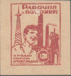 1932(?) г. Разм. 48 х 51 мм. Одноцветная печать на желто-ватой бумаге. В прямоугольной рамке разм. 34 х 42 мм человек перед микрофоном на фоне радиомачты и завода. Сверху текст в две строки: «Рабочий и колхозник». В правом нижнем углу продолжение текста в три строки: «В ряды общества Друзей Радио».