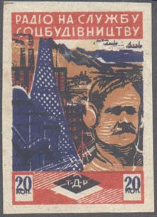 1932 г. Трехцветная и многоцветная печать на белой бумаге. В прямоугольной рамке различные сюжеты. Сверху текст на украинском языке: «Радио на службу социалистического строительства». Внизу эмблема общества. В нижних углах номинал.