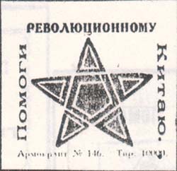 1926(?) г. Разм. 43 x 42 мм. Одноцветная печать на толстой белой бумаге. В центре пятиконечная звезда из декоративных элементов. По периметру текст: «Помоги революционному Китаю». Внизу выходные данные мелким шрифтом: «Армокрлит. № 146. Тир. 10000».
