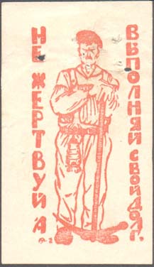 1926 г. 01.-03.11.1926 г. Разм. 36 х 62 мм. Одноцветная печать на белой плотной глянцевой бумаге. В центре шахтер, опирающийся на кирку. Слева и справа вертикально текст: «Не жертвуй, а выполняй свой долг».