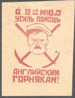 1926 г. 01.-03.11.1926 г. Разм. 42 х 56 мм. Одноцветная печать на желто-серой бумаге. В центре скрещенные кирки и голова шахтера в кепке. Сверху текст в две строки: «В 12–ый МЮД. Усиль помощь». Внизу продолжение текста в две строки: «Английским горнякам!».