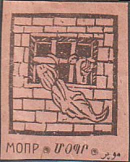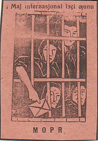 1931 г. 01.08.1931 г. Разм. 50 х 75 мм. Одноцветная печать на желтоватой бумаге. В центре четверо заключенных, один из которых протягивает письмо через решетку. Сверху текст на азербайджанском языке латинским шрифтом: «1 августа день». Внизу продолжение текста на азербайджанском языке латинским шрифтом: «МОПР».