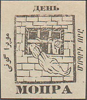 1927 г. 18.03.1927 г. Разм. 47 х 54 мм. Одноцветная печать на светло-серо-зеленой бумаге. В прямоугольной рамке разм. 34 х 48 мм в центре эмблема МОПР. По наружному периметру рамке текст: «День МОПРА» на русском, армянском и азербайджанском (арабским шрифтом) языках.