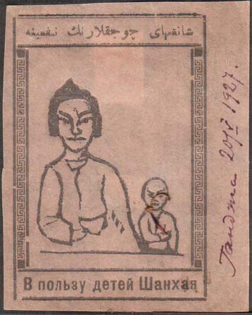 1927 г. 20.05.1927 г. Разм. 53 х 73 мм. Одноцветная печать низкого качества на желто-серой бумаге. В прямо-угольной декоративной рамке разм. 46 х 68 мм в центре женщина с ребенком. Сверху текст на азербайджанском языке арабским шрифтом. Внизу текст: «В пользу детей Шанхая».