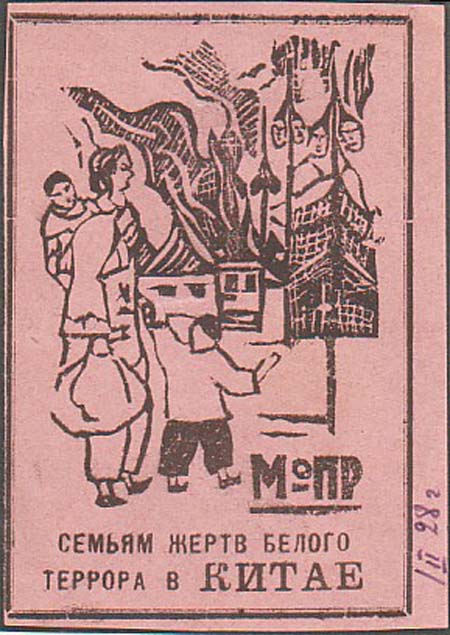1928 г. 01.02.1928 г. Разм. рамки 61 х 97 мм. Одноцветная печать на розово-серой бумаге. В прямоугольной рамке в центре женщина с узлом и двумя детьми на фоне горящих зданий. Внизу текст в три строки: «МОПР семьям жертв белого террора в Китае».