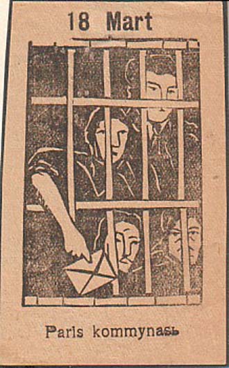 1931 г. 18.03.1931 г. Разм. 55 х 87 мм. Одноцветная печать на желтоватой бумаге. В центре четверо заключенных, один из которых протягивает письмо через решетку. Сверху текст на азербайджанском языке латинским шрифтом: «18 марта». Внизу продолжение текста на азербайджанском языке латинским шрифтом: «Парижская коммуна».